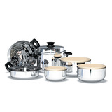 В набор входят 4-литровая кастрюля с крышкой, двойная вставка для готовки на пару, набор из 3 емкостей с крышками.